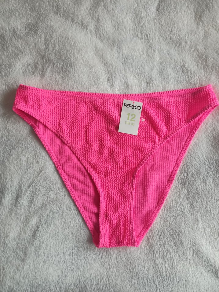 Pembe, elastik bel bantlı, mini kesim kadın bikini altı. Plaj için uygun, renkli ve cesur tarz sunar. Marka: Pep&Co, beden 12.