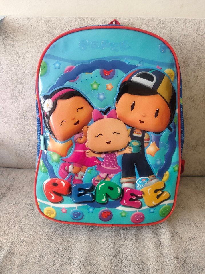 Canlı ve renkli tasarıma sahip çocuk okul çantası, önünde neşeli çizgi film karakterleri bulunur. Çocuklar için uygun ve eğlenceli görünümlü.
