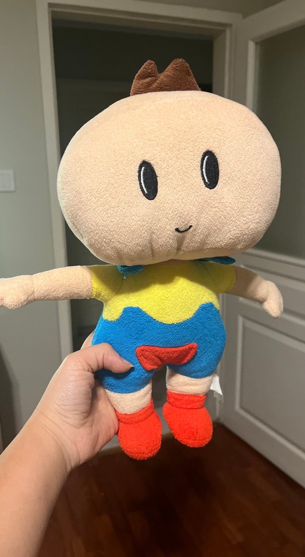 Yumuşak dokulu, pastel renklerde, çok renkli kıyafetli ve basit işlemeli yüzü olan peluş oyuncak. Parlak renklerle tasarlanmıştır.