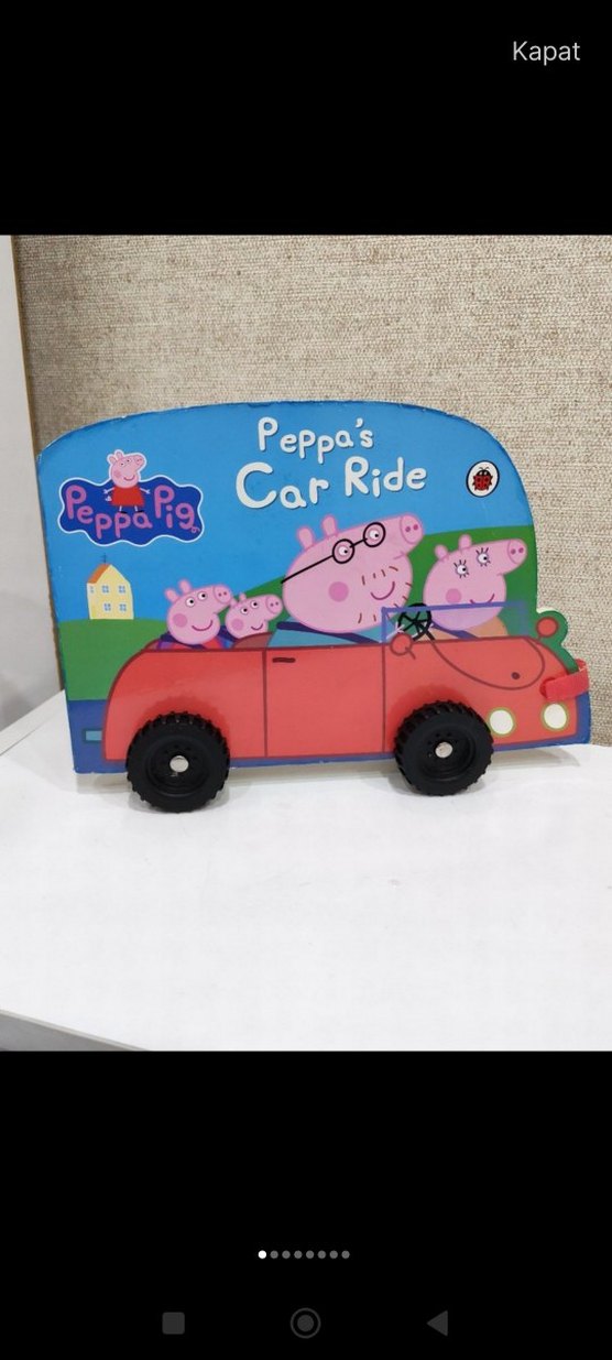 Peppa ve ailesinin araba yolculuğunu anlatan, araba şeklinde kalın sayfalı renkli çocuk kitabı.