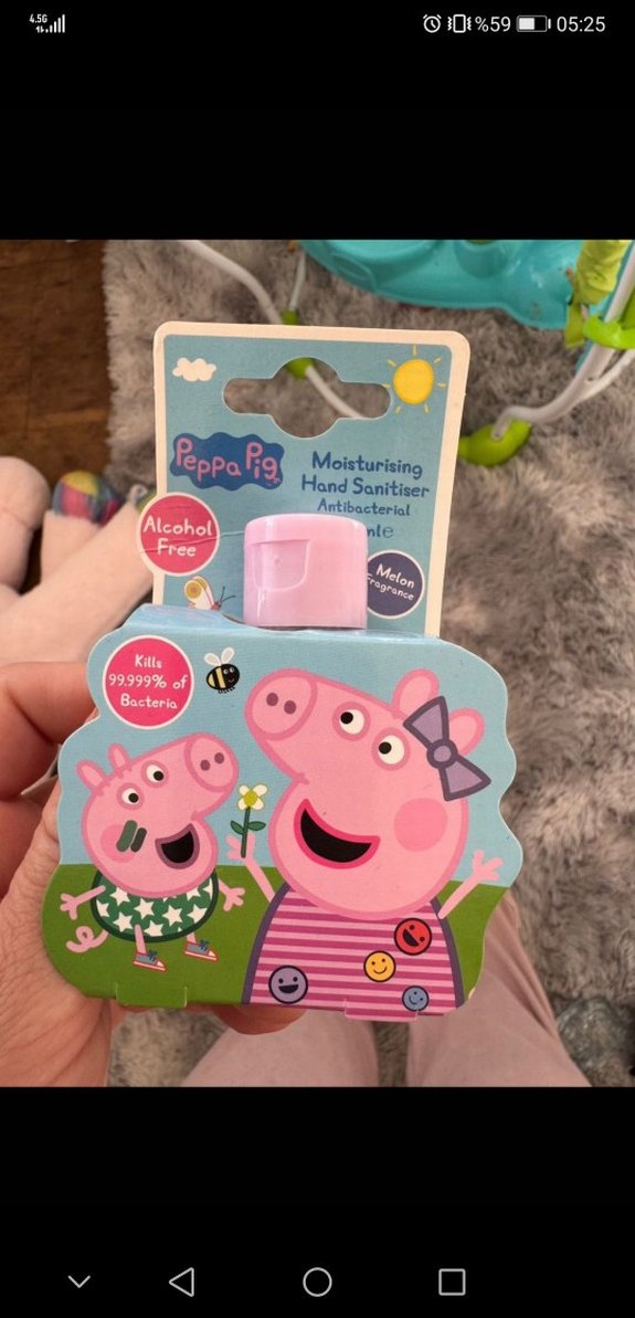 Peppa Pig temalı pastel pembe el dezenfektanı, alkol içermez, %99,999 bakteriyi öldürür, elleri nemlendirir ve kavun kokuludur.