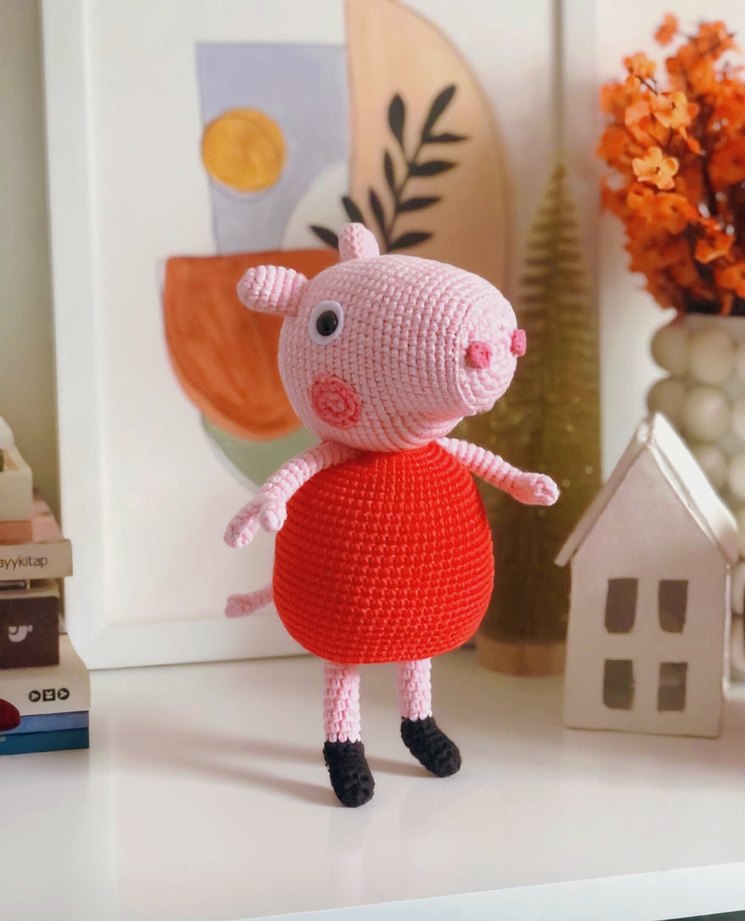 Pembe renkli, kırmızı elbiseli ve siyah ayakkabılı örgü peluş oyuncak. Hem dekoratif hem de oyun için uygundur.