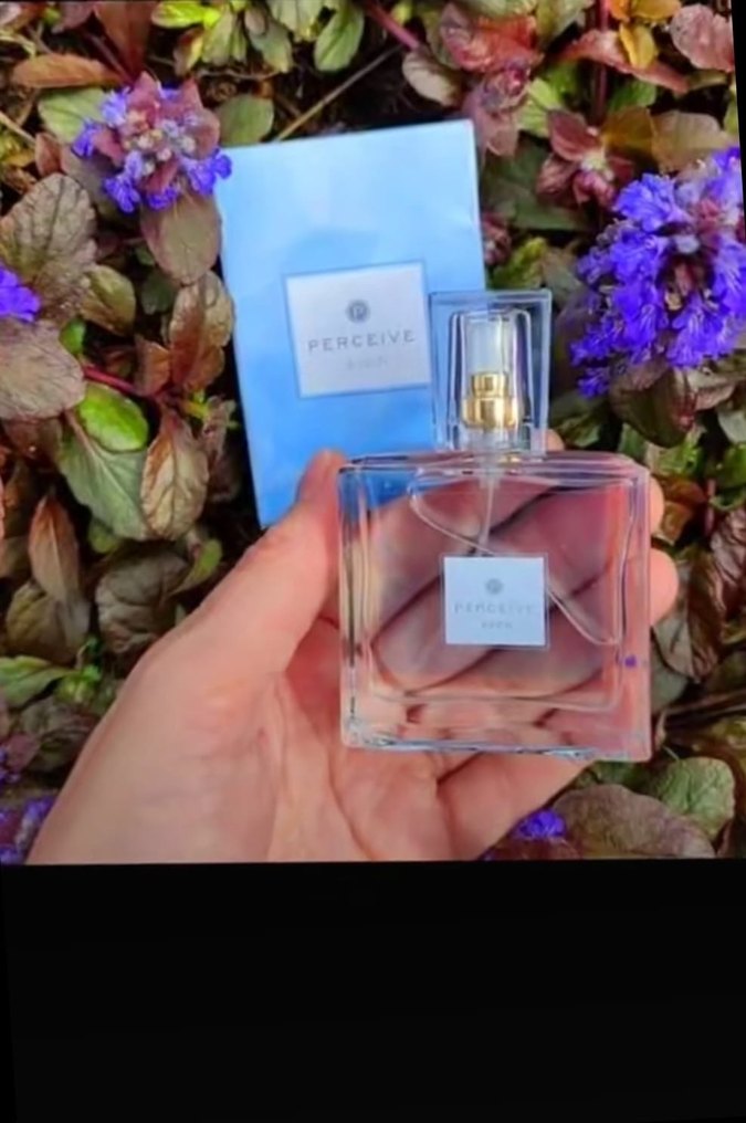 Perceive kadın parfümü, altın renkli sprey başlıklı şeffaf cam şişede ve açık mavi kutuda sunulur. Ferah ve zarif bir koku sağlar.