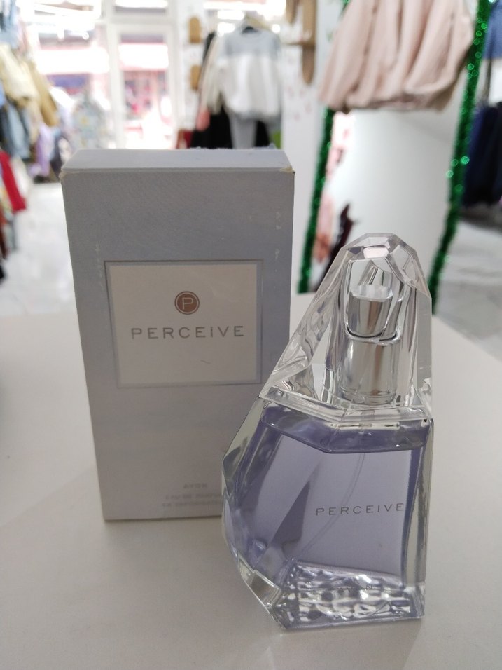 Perceive kadın parfümü, şeffaf ve benzersiz tasarımlı şişede, hafif lavanta kokusuyla. Açık gri kutusunda sunulur.