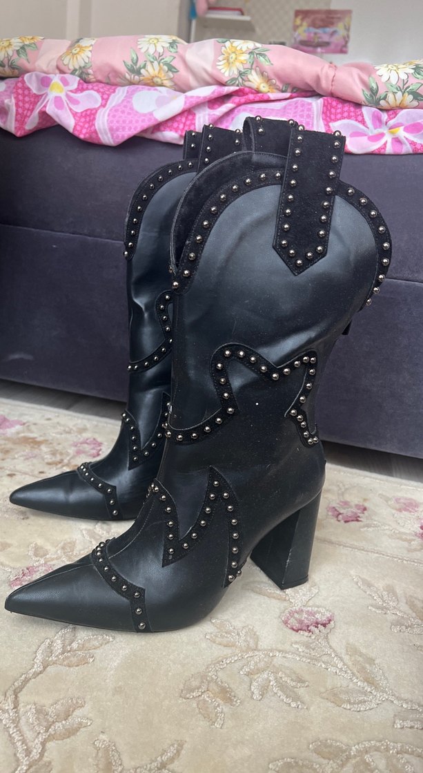Siyah deri, yüksek topuklu botlar, perçinli desenler ve tokalı detaylarla cesur gotik tarzı için uygundur.