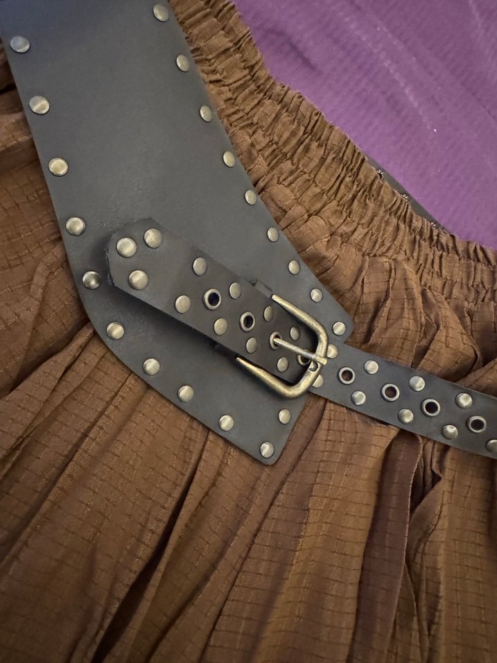 Hiç giyilmedi marka temsili. M/L uyumlu Kahverengi deri, perçinli ve tokalı kadın kemeri. Rock punk tarzında, grunge punk modasına uygun dayanıklı tasarım.