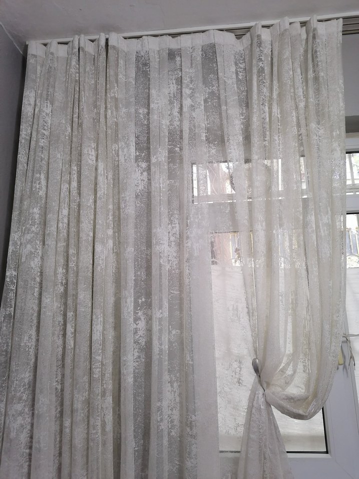 perde açık tonda kırık beyaz deseni göründüğü gibi yeni alındı sayılır kendim diktirmistim brillant veya taç ürünü yazısız kumaştan diktirmistim sağdan sola 2/70 boy 2/10 dur