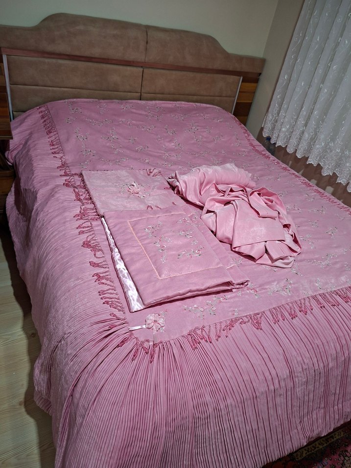 Pastel pembe renkte, nakış detaylı ve kenarları pileli yatak örtüsü, yatak odasına zarif bir dokunuş katıyor. ürün sıfırdır hiç kullanılmamıştır ürün içeriği: yatak örtüsü ,2 adet yastık kılıfı, 1 adet kare kırlent kılıfı,2 adet perde , yatak örtüsü ve yastık kılıfları yıkanmıştır kırlent kılıfı ve perdeler yıkanmamıştır