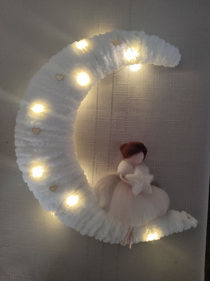 Nakışlı detaylara sahip beyaz yün ay süsü, yumuşak ışıklarla ve yıldız tutan bebek figürü ile çocuk odalarına uygun.