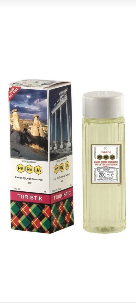 Perija Turistik limon çiçeği kolonyası 200 ml şişede, ferah ve narenciye kokusuyla sunulur. Ambalajda turistik görüntüler yer alır.