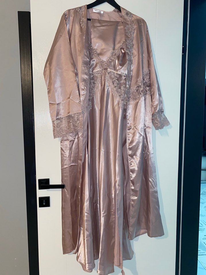 Bol kesim, parlak bej kumaşlı kadın pijama takımı. Nakışlı, askılı uzun gecelik ve uyumlu sabahlık içerir, vintage bohem tarzını yansıtır. kutusunu bulamıyorum o yüzden uyguna koyuyorum hiç giyilmedi sıfır ayarında