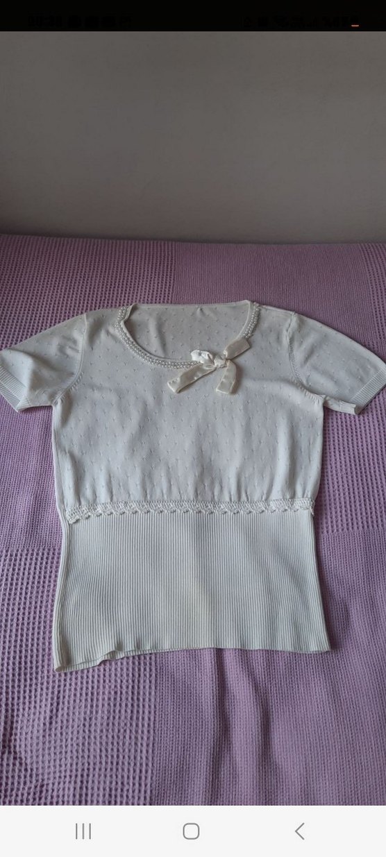 kirik Beyaz, kısa kollu, yuvarlak yaka, triko merserize bluz. Örgü detaylı ve fiyonk suslemeli