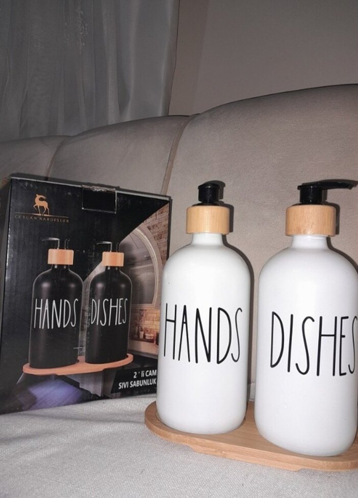 Perotti markalı, üzerinde 'HANDS' ve 'DISHES' yazılı beyaz 2'li sıvı sabunluk seti, ahşap tepsi ile birlikte.