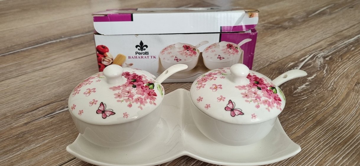 Perotti beyaz baharatlık seti, kapaklı ve kaşıklı, çiçek ve kelebek desenleriyle mutfağa şıklık katıyor.
