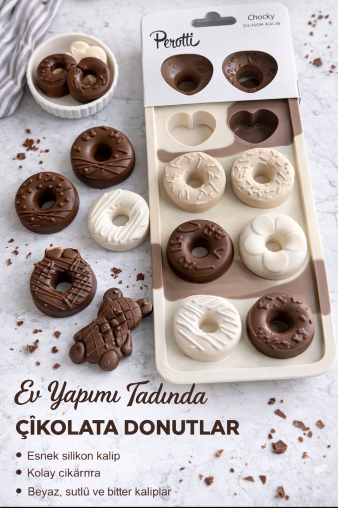 Perotti'nin esnek silikon kalıbı, ev yapımı tadında çikolata donutlar için uygundur. Kolay çıkarma özelliği ve farklı donut şekilleri bulunur. Fırında güvenle kullanılabilir.Chocky silikon 12li kek kalıbı. Çoklu alım için ilan açtırmanızı rica ederim.Stoklarda mevcuttur.