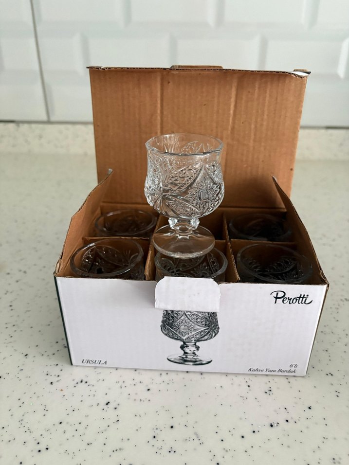 Perotti markalı, işlemeli koyu bej renkte klasik tasarımlı 6'lı cam bardak seti. İçecek servisinde şıklık sağlar.