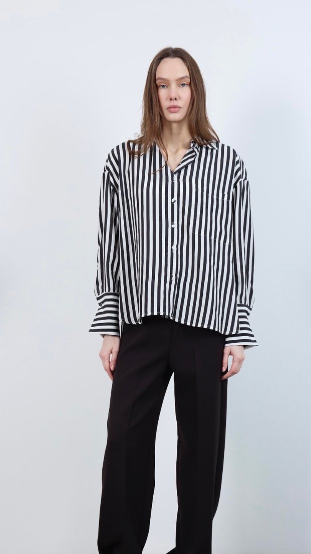 Yumuşak pamuk kumaştan, uzun kollu, oversize kesim siyah beyaz çizgili gömlek. Ofis için rahat ve şık bir seçenek.