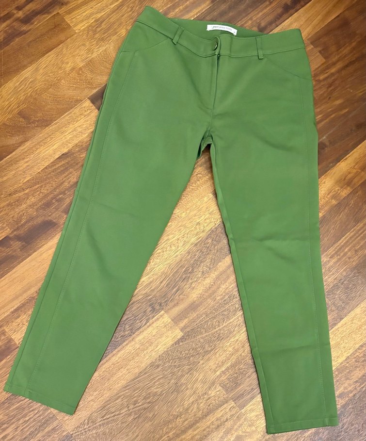 Hiç kullanılmadı. 40 beden. Kadınlar için parlak yeşil renkte, regular fit pantolon. Dış mekan kullanımı için uygun, rahat ve şık bir görünüm sunar. Gri düğmeleri parlak metal. Kumaşını bilemiyorum ama yapısı tüylenme yapmayacak şekilde hafif parlak duran düzgün dikişli bir pantolon. İş ortamı veya şık bir üst ile yakışacağını düşünüyorum.