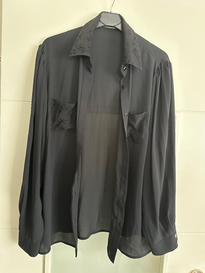 Siyah, uzun kollu, yakası kesik ve düğmeli kadın gömleği. Gevşek kesim ve ipeksi dokusu ile ofis için uygun, gotik tarzda. 40-44 arası bedenlere uygun.