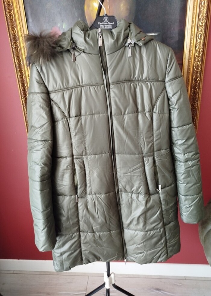 Haki renkli kapşonlu, kapı onunda detaylı enfes bir parça. Kapı onda, detayı da çıkartılabilir. Çift fermuarlı alttaki fermuarında kayıp parça var. İki kol arası mesafesi montun önü kapalı iken 53 cm boyu 82 cm #mont # #şişmemont