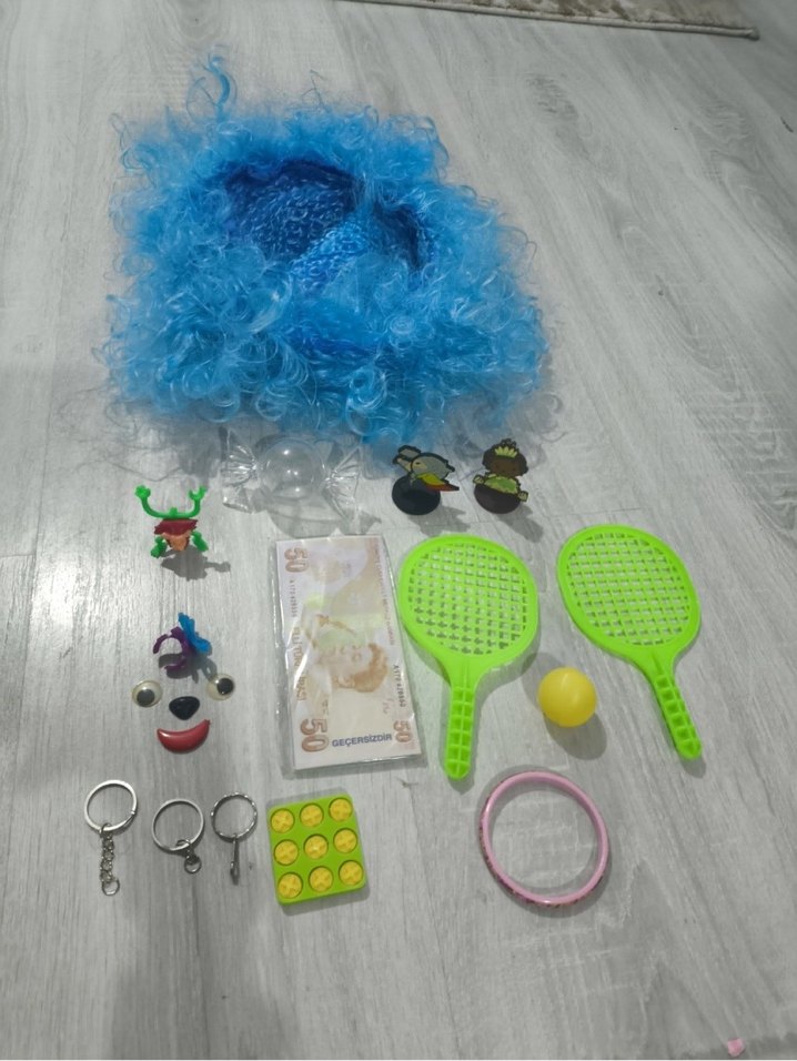 paketinde geçersiz para kağıdı, küçük sos oyuncağı, palyaço peruk görüldüğü gibi taranması gerek, barbie bilezik , anahtarlık demirleri ve görünen oyuncaklar hepsinin fiyatidir