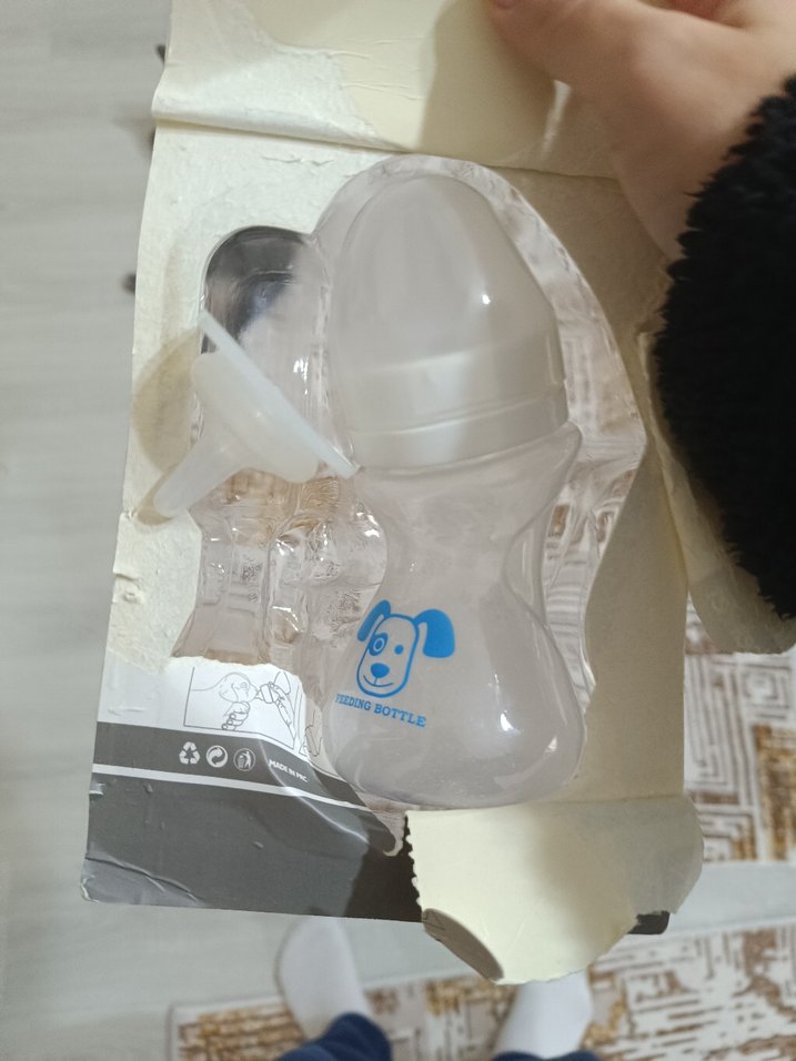 Mavi köpek logosu bulunan şeffaf pet biberonu. yedek aparat içerir.