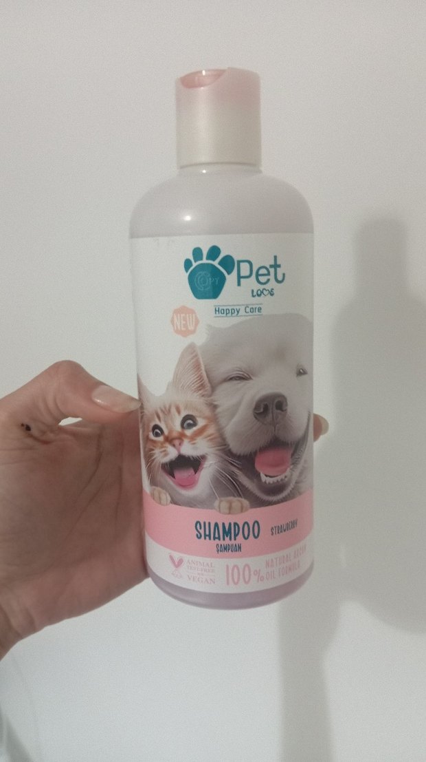 Pet Love Happy Care, kedi ve köpekler için çilek kokulu şampuan. Formülü %100 doğal ve vegandır. GÖSTERDİĞİM YERE KADAR DOLUDUR