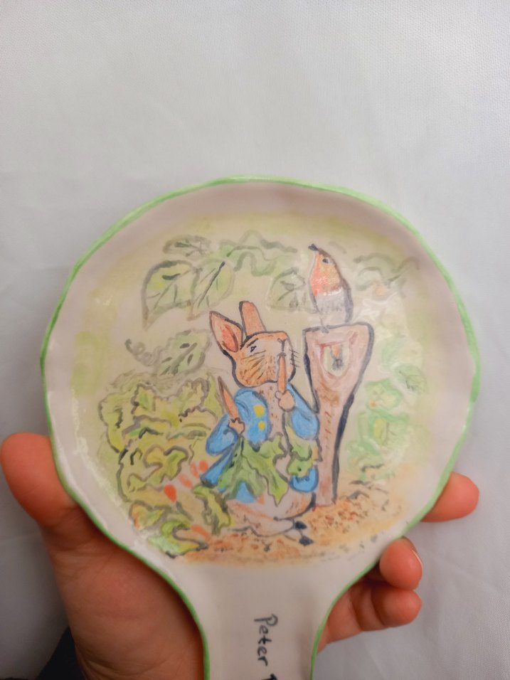 Pastel yeşil renkte, Peter Rabbit figürlü seramik kaşıklık tamamen el yapımı ve el boyamasıdır elde yıkama önerilir almadan önce mevcut olup olmadığını sorun