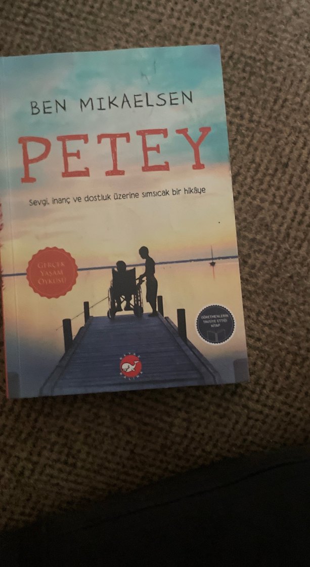 Ben Mikaelsen'in Petey kitabı, sevgi, inanç ve dostluk üzerine sıcak bir hikaye sunuyor. Kapakta günbatımında su kenarında iki figür yer alıyor. SIFIR ÜRÜN