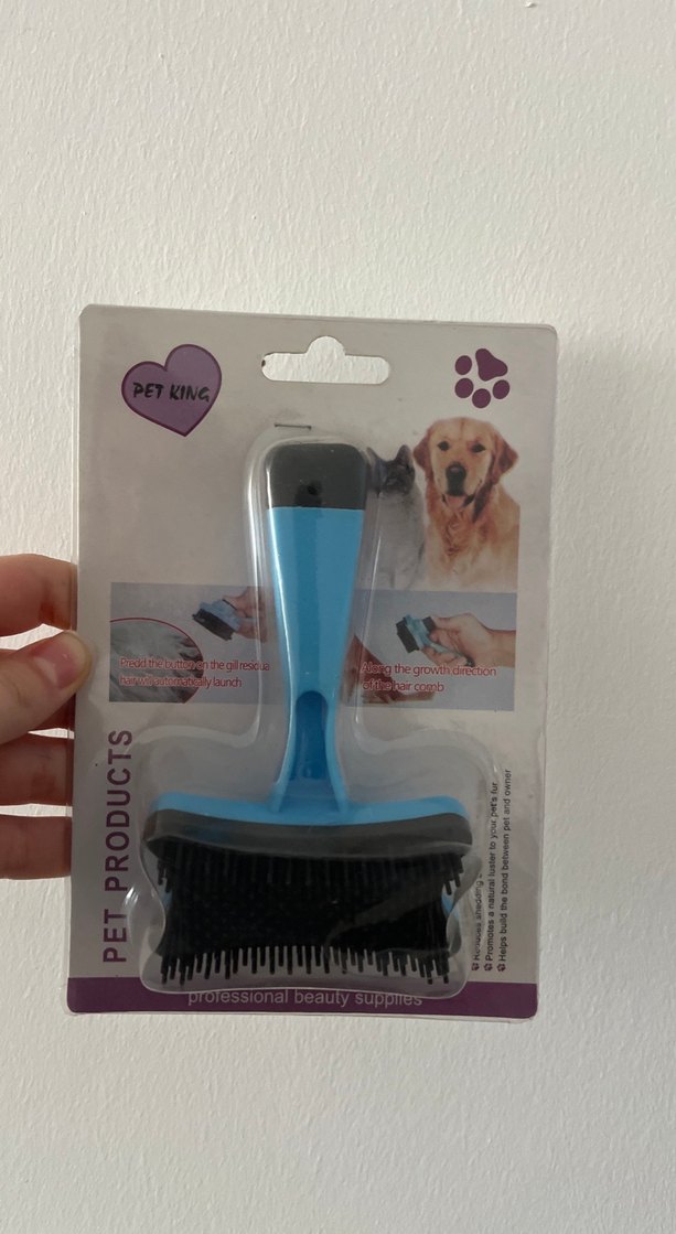 PETKING marka koyu mavi kedi tüy fırçası, dökülen tüyleri toplar ve tüy dökülmesini azaltır. Rahat saplı ve ince kıllıdır.