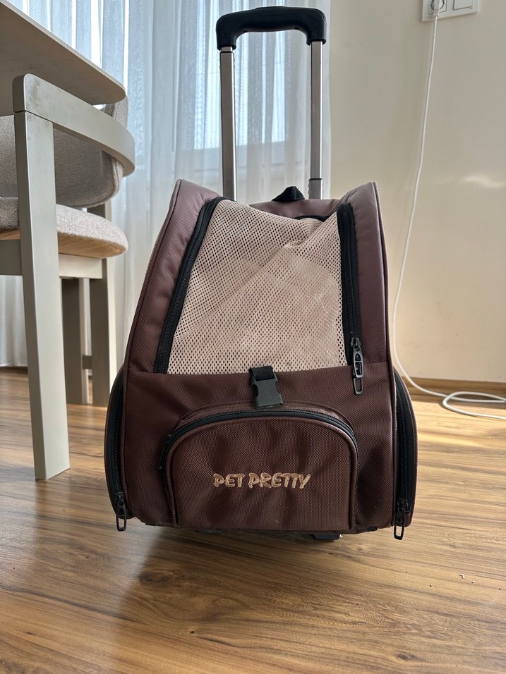 PETPRETTY kahverengi seyahat taşıyıcı, havalandırma için file panellere ve ön cepte saklama alanına sahiptir. Kolay taşımak için teleskopik saplıdır. Balkonda durduğu için kirlenmiş