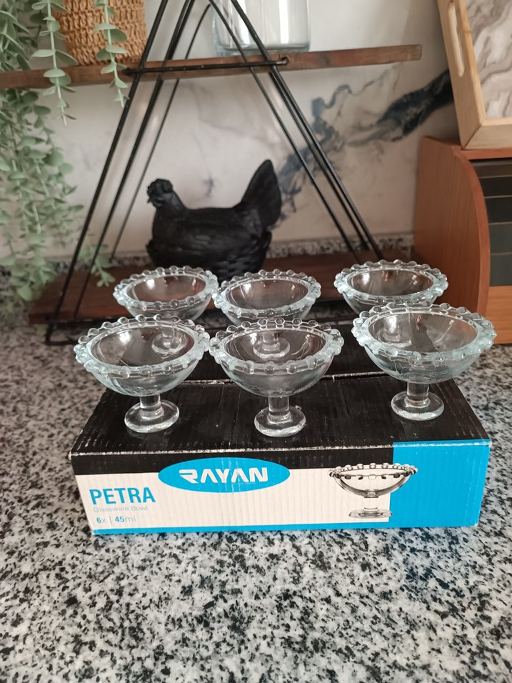 6'lı cam kase seti, dekoratif kenarları ve küçük ayaklı tabanlarıyla tatlı veya atıştırmalık sunumu için uygundur. Orijinal Rayan Petra kutusunda ayaklı kahve yani lokumluk.