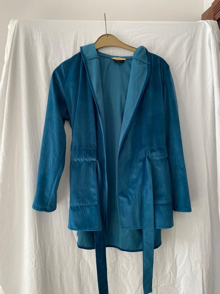 Drapeli tasarıma sahip, petrol rengi süet ceket. Notlu yaka ve uzun kollu, minimalist ve çağdaş tarzda, günlük kullanıma uygun.