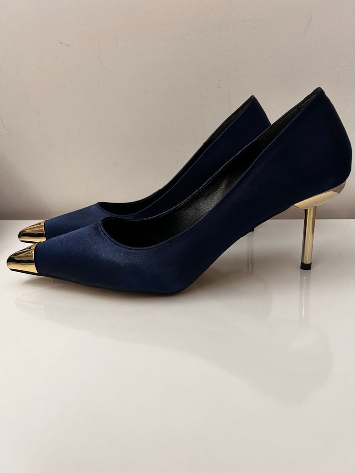 Petrol mavisi süet stilettolar, parlak metal uçlu topukları ve ince topuklarıyla modern klasik ofis şıklığı sunar. Düz ve tokalı detaylı tasarıma sahiptir.