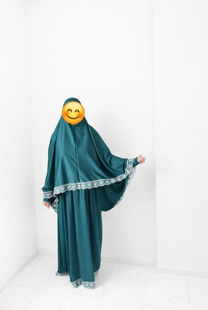 petrol yeşili renkte, nakışlı desenlere sahip uzun ve salaş kesim kadın elbisesi. Yüksek yakalı ve askılı kolludur, günlük kullanıma uygundur.