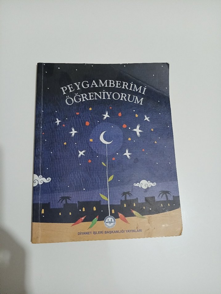 Diyanet İşleri Başkanlığı yayımlı, yıldızlar ve hilal ayın olduğu gece temalı kapaklı 'Peygamberimi Öğreniyorum' adlı şiir kitabı.