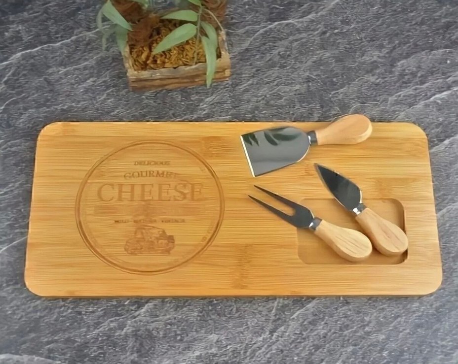Kahverengi renkte, üzerinde baskılı detaylar bulunan ahşap peynir kesme tahtası ve üç farklı peynir bıçağı seti. Hiç kullanılmadı paketli şekilde.
