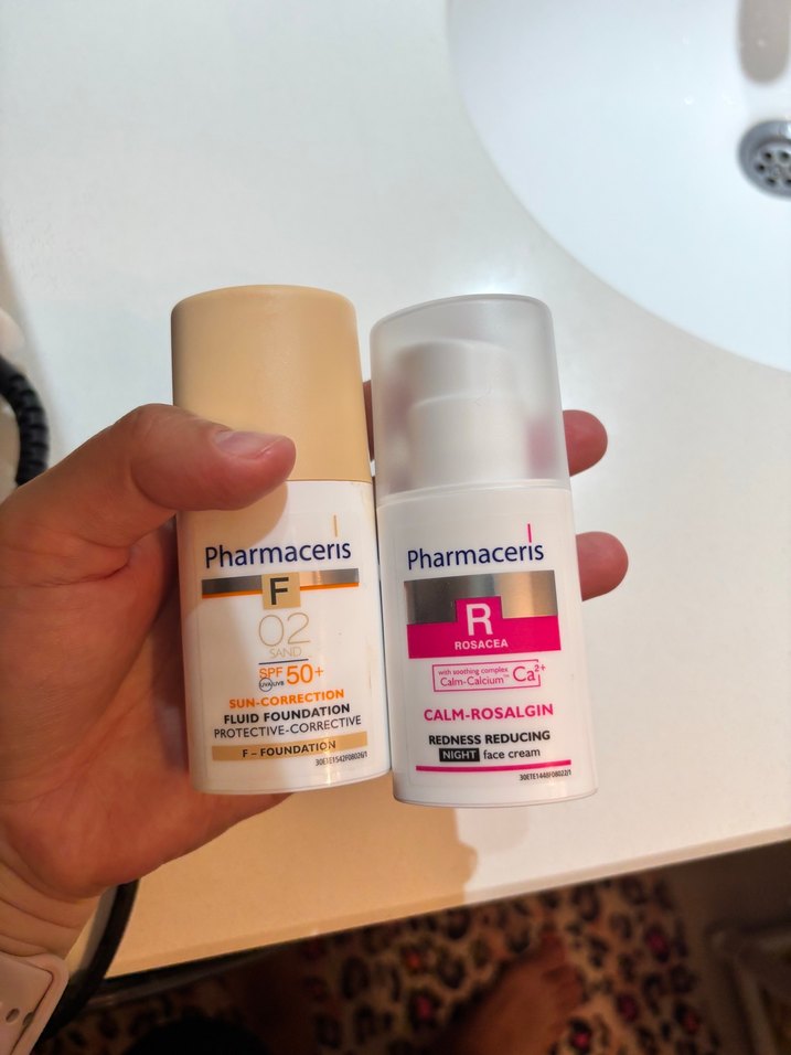 Pharmaceris markasının SPF 50+ korumalı likit fondöten ve kızarıklık azaltıcı gece yüz kremi, hassas ve kızarık ciltler için uygundur.