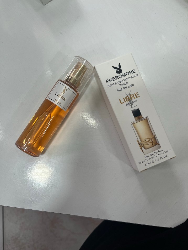 Pheromone kadın parfümü, 45 ml sprey şişede, sıcak amber renkte. Tester versiyon olup satışa sunulmamıştır.