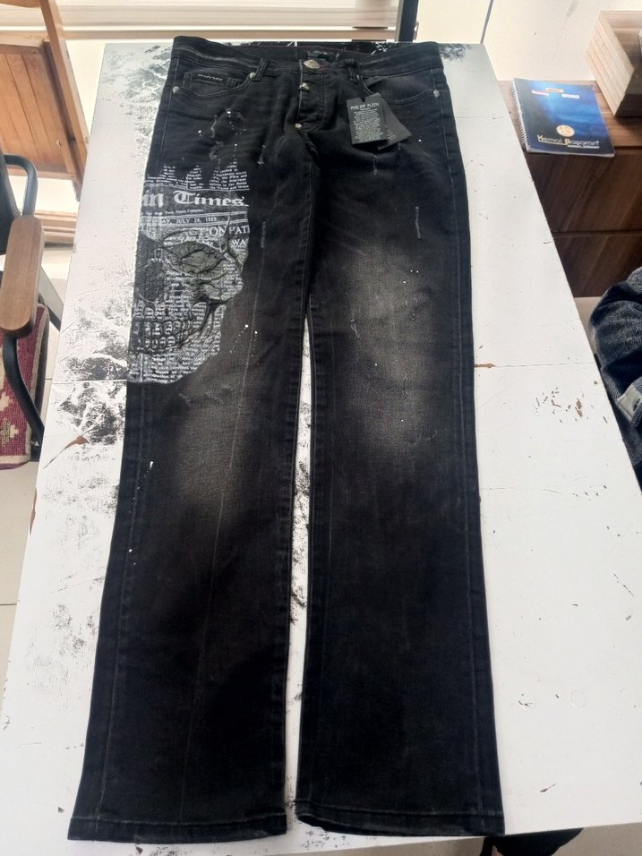 Siyah baskılı desenlere ve tokalı detaya sahip, normal boy ve regular fit erkek denim pantolon. Günlük sokak stili için uygundur.