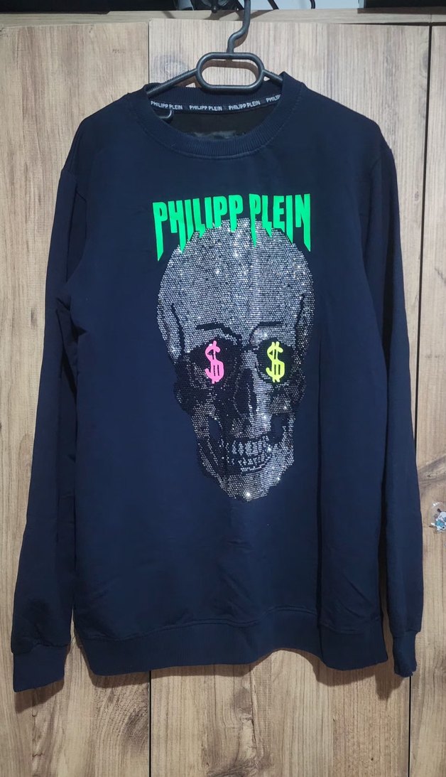 Siyah, uzun kollu, yuvarlak yaka sweatshirt. Canlı renkli dolar işaretli kafatası baskısı ve rahat kesim hic kullanilmadi arka kisminda leke gibi bişey var fakat goze batan sorunu yoktur yikayinca cikarmi bilemem hediye gelmisti foto ekledim