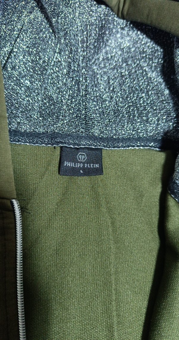 Philipp Plein markalı, parlak yeşil sentetik kumaştan, fermuarlı, kapüşonlu, baskılı desenli ve uzun kollu bayan sweatshirtü.