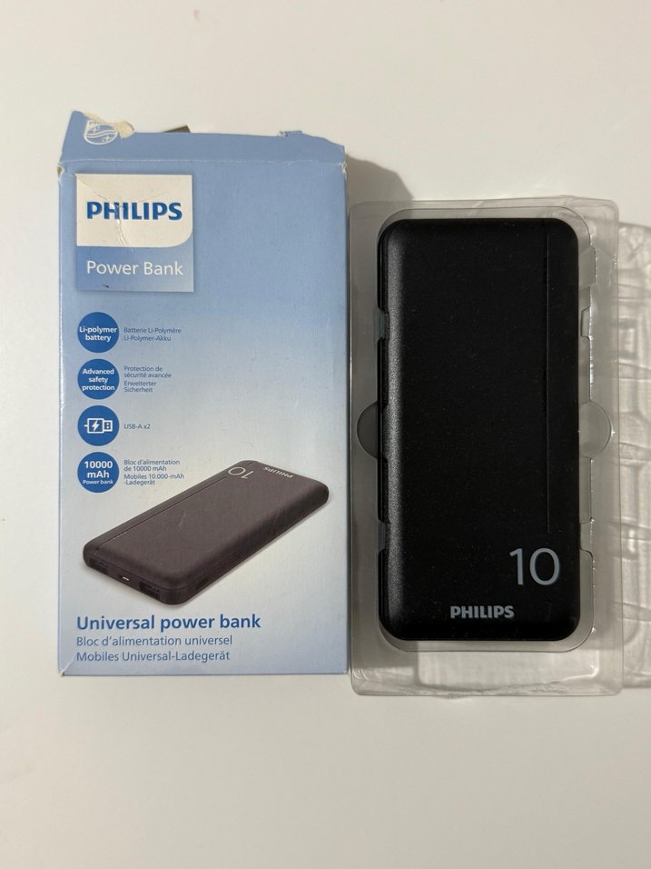 Philips power bank, 10.000 mAh kapasiteye sahip siyah renkli, çeşitli mobil cihazlarla uyumlu, güvenilir şarj sağlar.