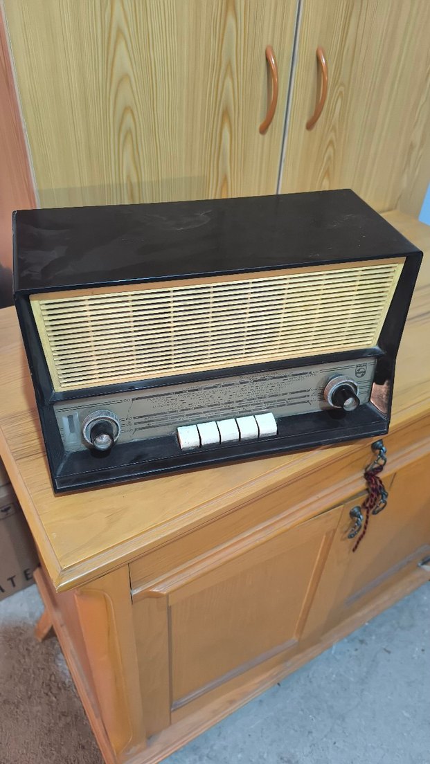 Philips Antika Tüplü Transistörlü Radyo. Arka kapak yok. Bir yan tarafında çatlak var. Tüm tüpler yerinde fişe takınca tüpler çalışıyor.