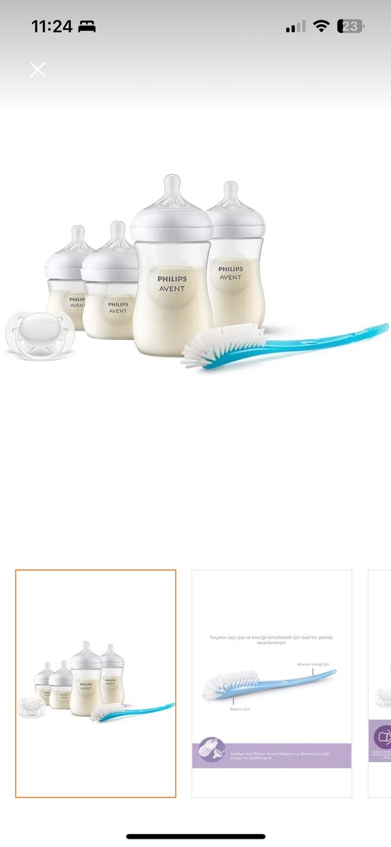 Philips Avent beyaz pastel renkli biberon seti, yumuşak emzik, emzik ve temizleme fırçası içerir. Bebeğim doğmadan almıştım 2 ve 3 numaralı emzikler mevcut. Fakat bebeğim bir türlü çekemedi çok severek almıştım ama hiç kullanamadım Başkasına faydam olsun istedim. Sadece küçük biberonlardan birinin emziğini iğneyle delmiştim 10 gün kadar kullandım başka biberon aldım sonra siz emziği atıp başka emzik alıp takabilirsiniz sıkıntı olmaz.