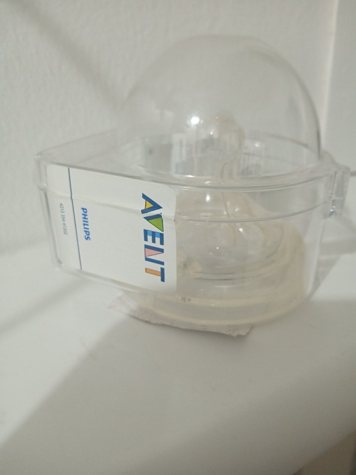Philips Avent markalı, beyaz renkte, şeffaf koruyucu bebek biberonu ucu Bebek beslemek için uygundur. 3 delikli üzerinde 4 yazıyor