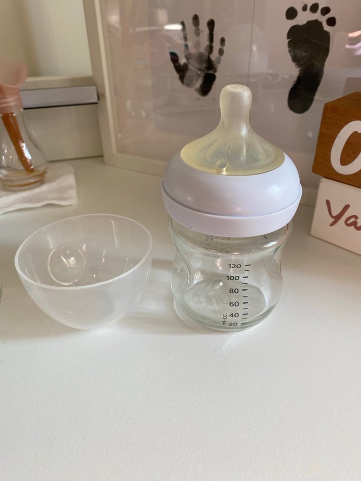 120 ml kapasiteye sahip beyaz bebek biberonu, koruyucu kapaklı ve net ölçü işaretleriyle birlikte gelir.