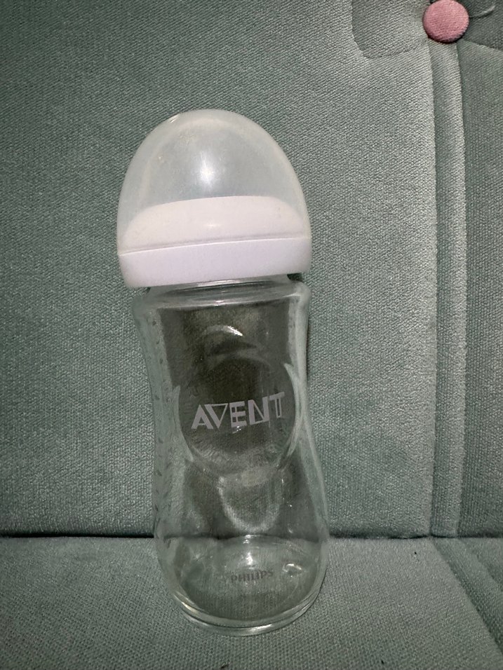 Philips Avent beyaz kapaklı ve cam gövdeli bebek biberonu, gri Avent logosuna sahiptir. Rahat besleme için uygundur. Emziksizdir.