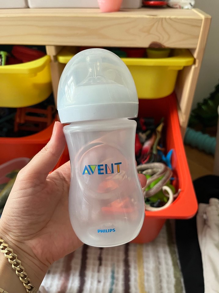 Philips Avent beyaz kapaklı, renkli logolu şeffaf bebek biberonu, kolay beslenme için tasarlanmıştır.