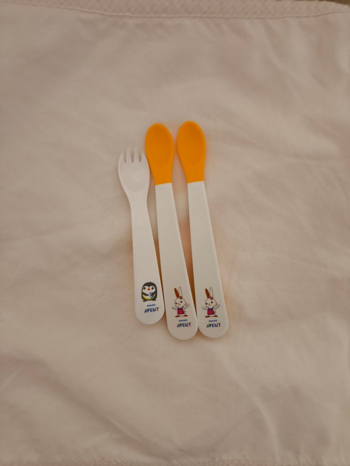 Sarı saplı, sevimli hayvan desenli renkli çocuk çatal, kaşık ve bıçak seti.
